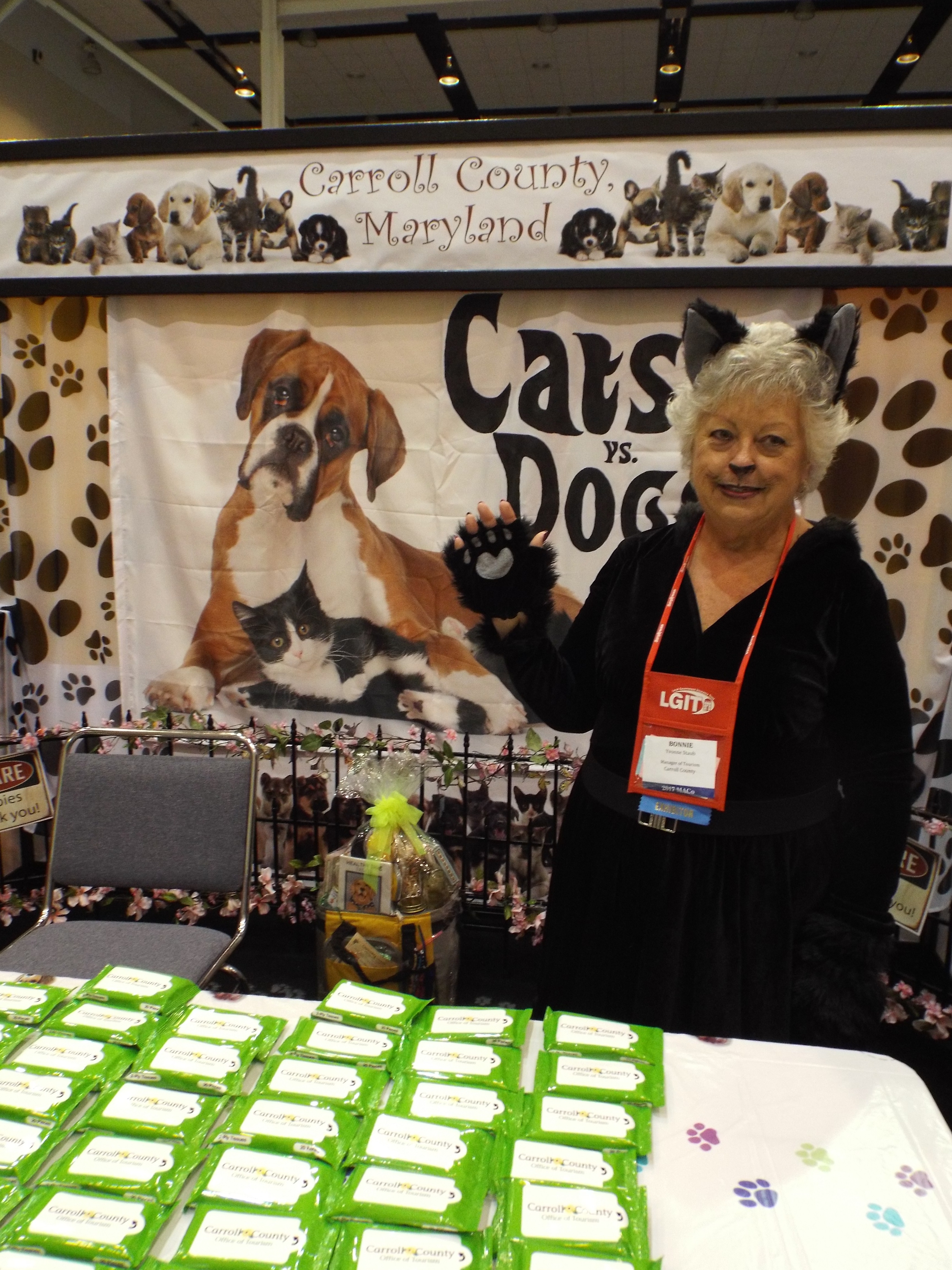 - There was a dog and cat theme for the opening night reception. Bonnie Staub, Carroll County’s tourism director, worked the county booth. MarylandReporter.com photo by Rebecca Nelson.