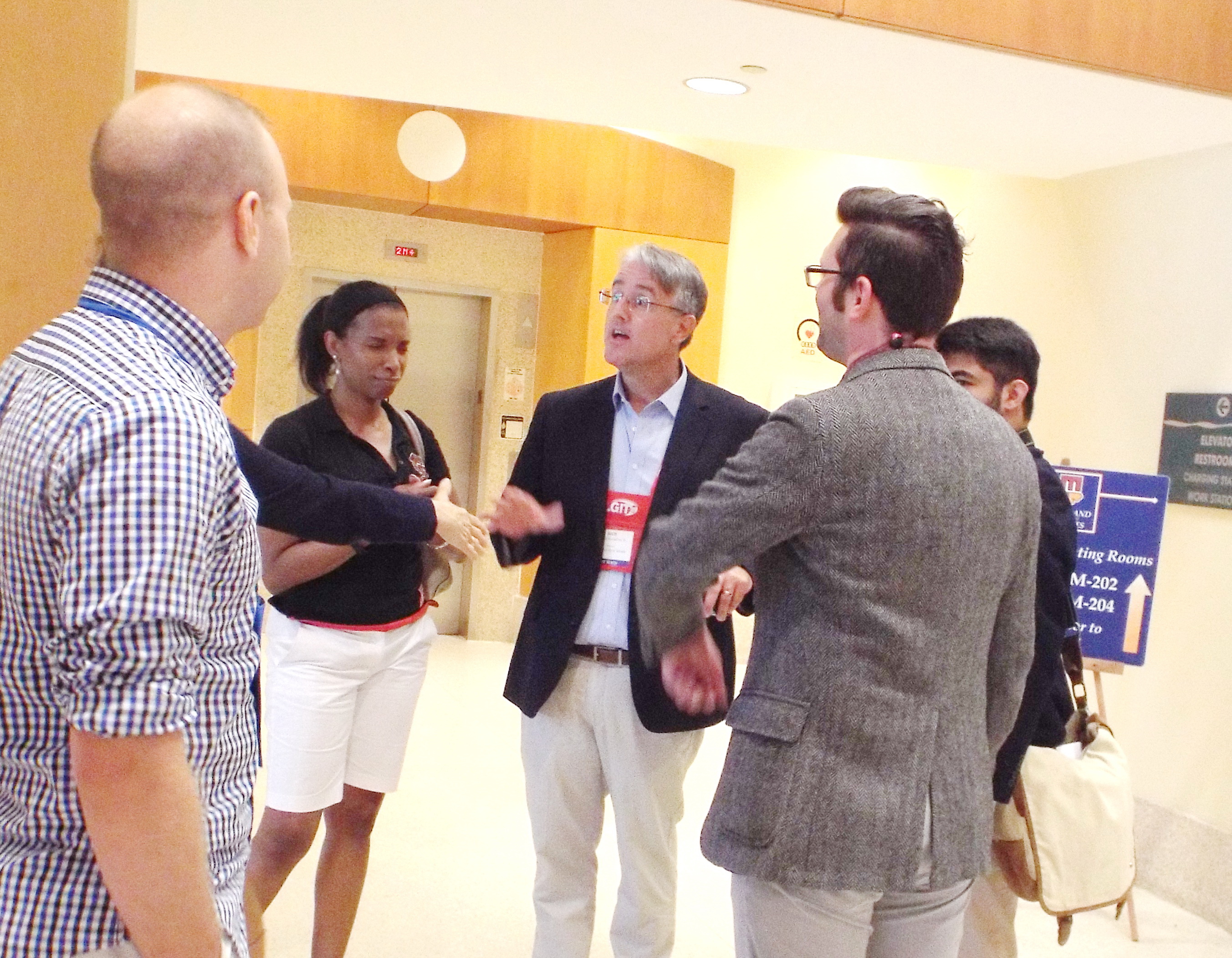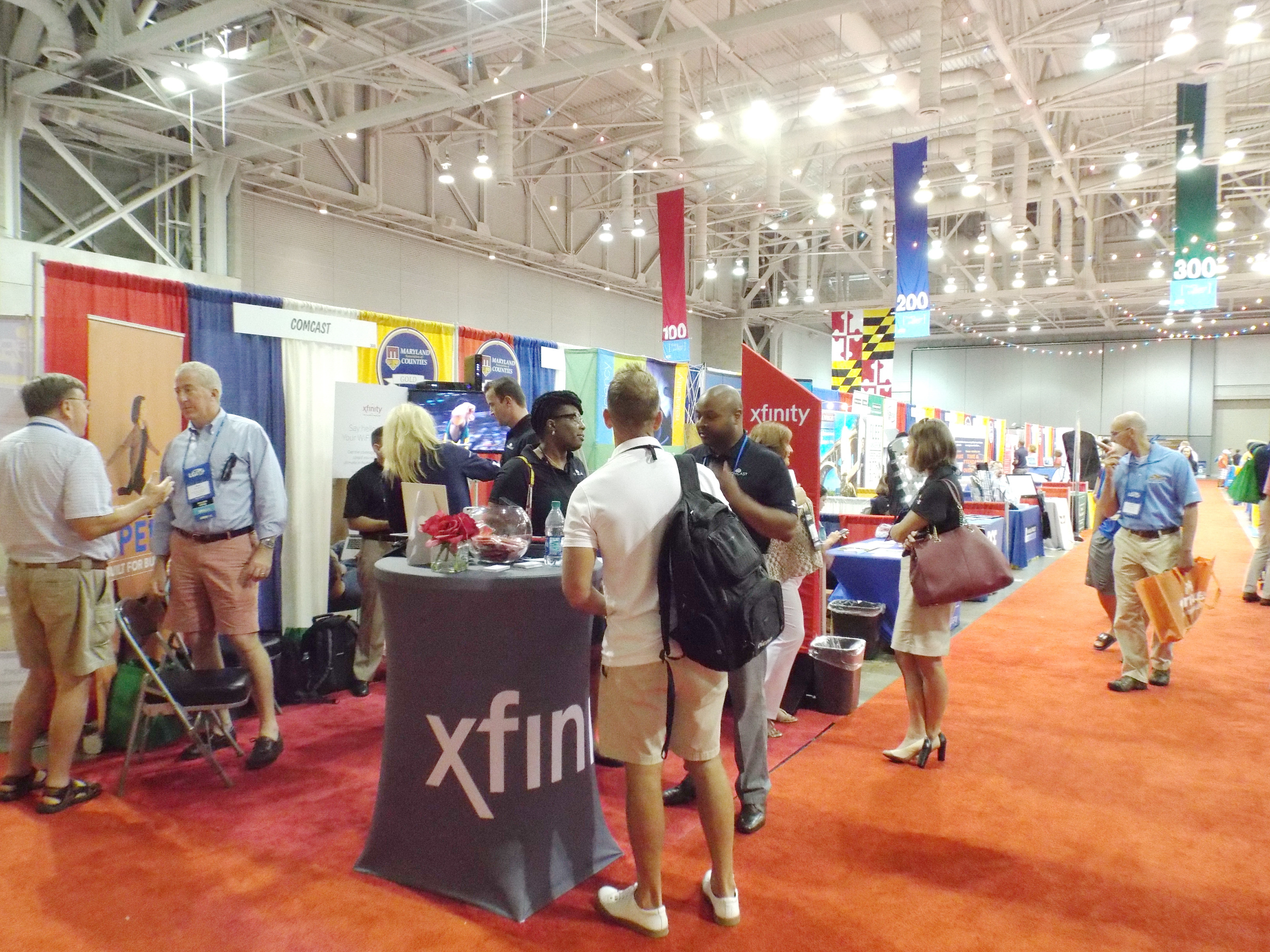 - At the Comcast booth in the exhibit hall, MarylandReporter.com’s editor Len Lazarick, far left, talks politics with Sean Looney, Comcast’s vice president for state government affairs. MarylandReporter.com photo by Rebecca Nelson.