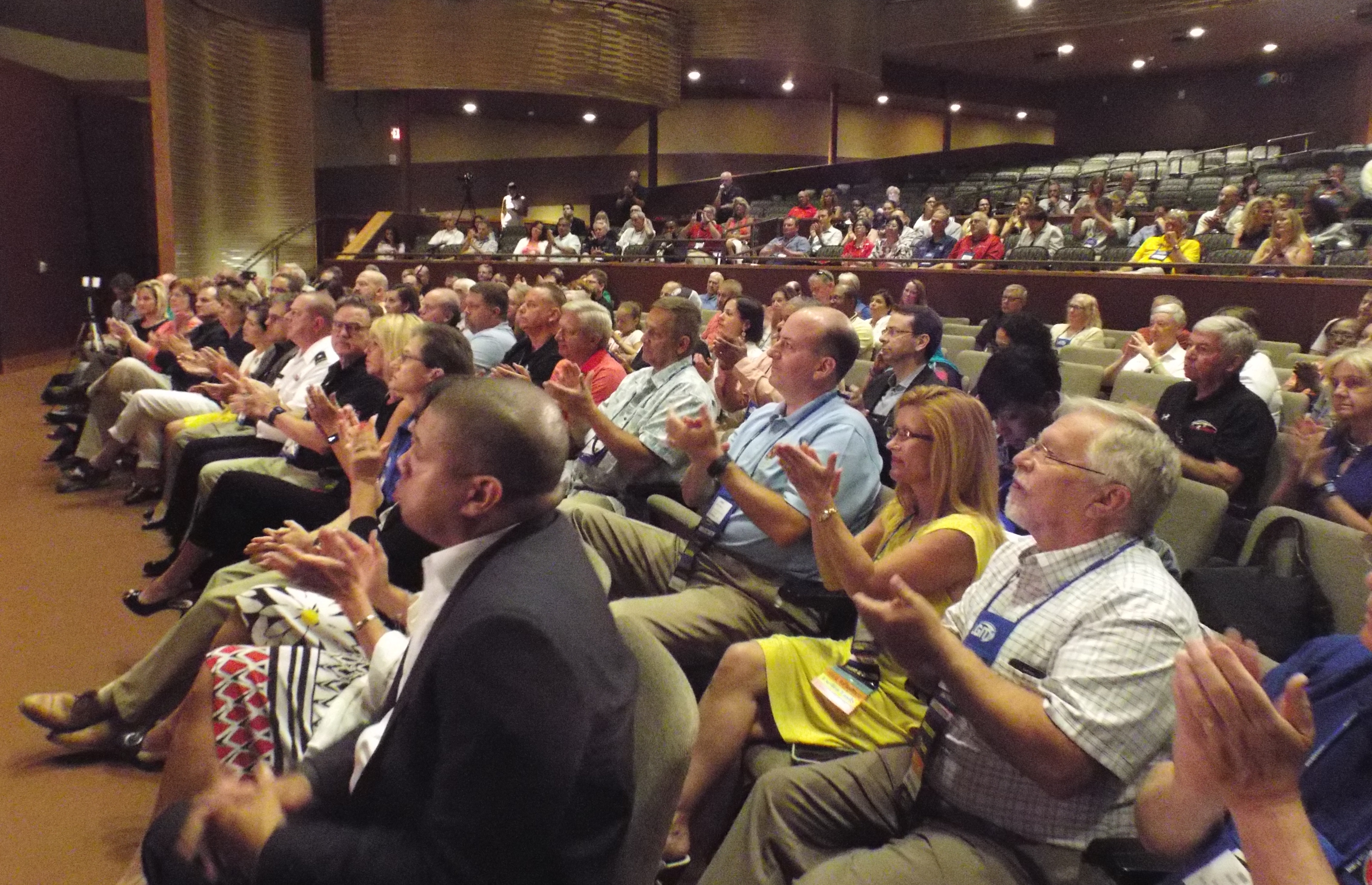 - Members of the Hogan cabinet in the first row and county elected officials applaud the governor’s speech. MarylandReporter.com photo by Rebecca Nelson.