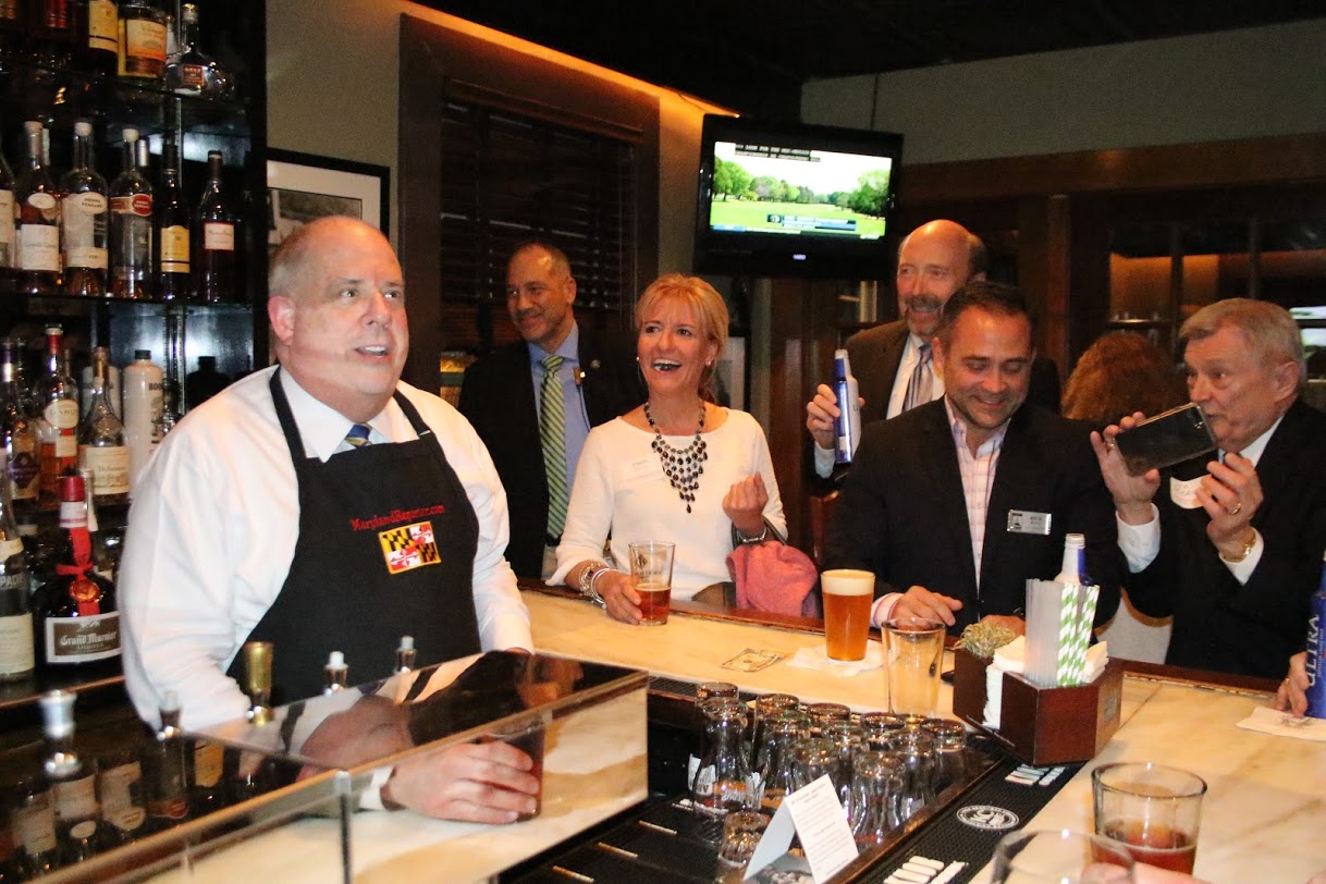 MarylandReporter.com honored over 100 News Match donors and their guests at a happy hour Wednesday night with Gov. Larry Hogan and Comptroller Peter Franchot as guest bartenders. Treasurer Nancy Kopp was also scheduled behind the “Bar of Public Works” at Harry Browne’s on State Circle in Annapolis, but sent her regrets due to illness.