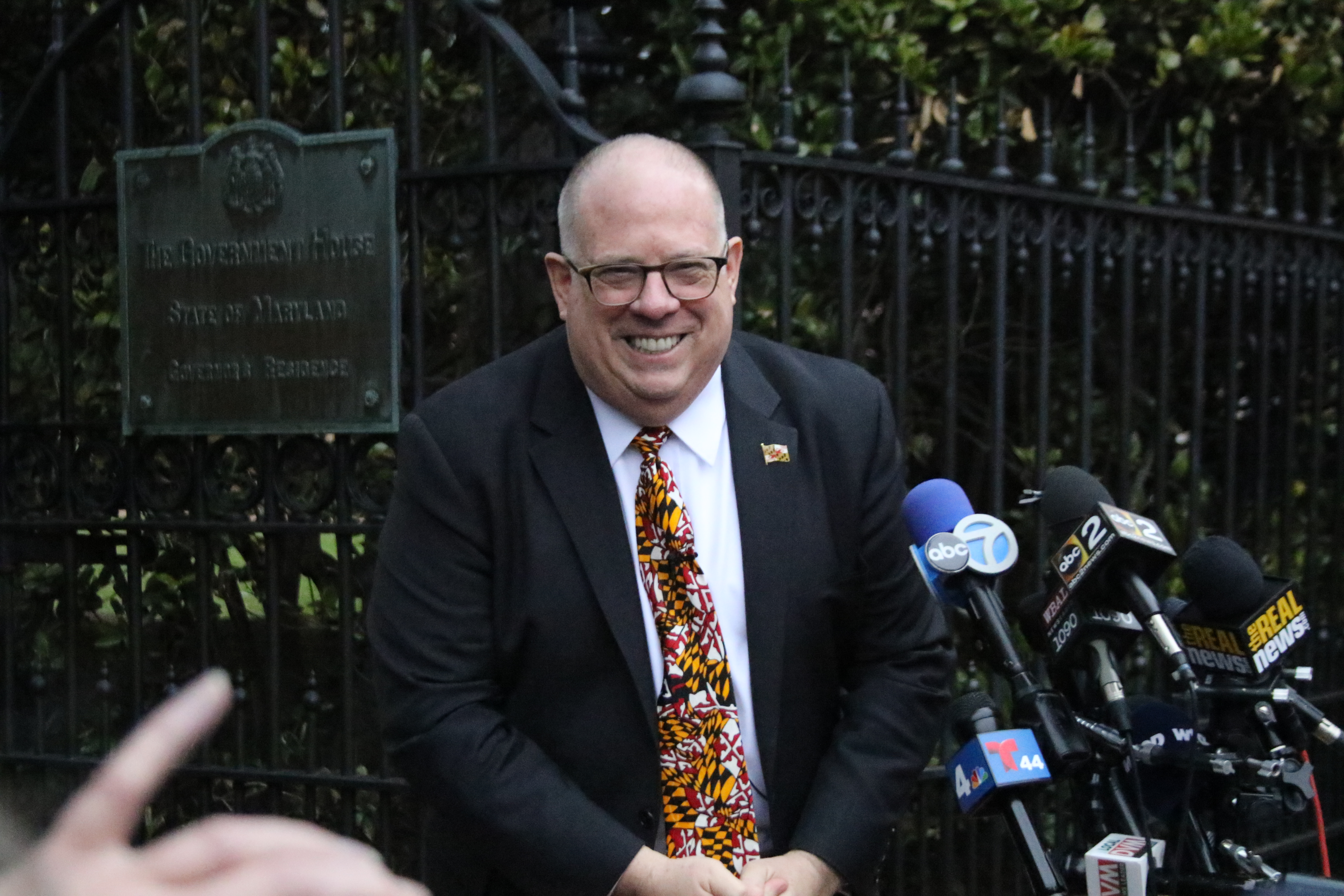 - Gov. Larry Hogan begins a news conference Monday afternoon at the gate to Government House.