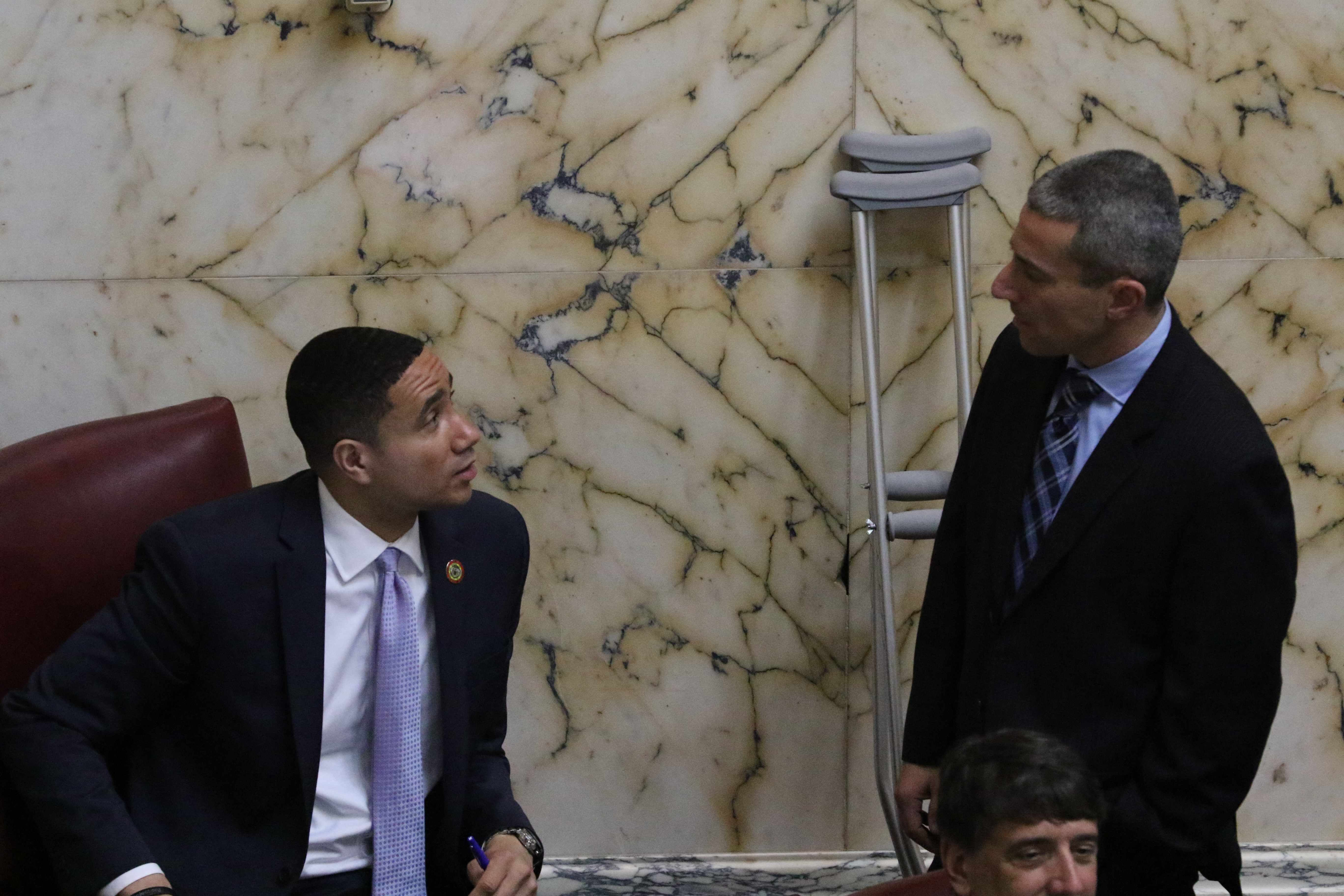 - Sens. Will Smith, D-Montgomery, and Bobby Zirkin, D-Baltimore County, talk at the back of the Senate chamber. Smith had surgery to repair a tendon on Friday.