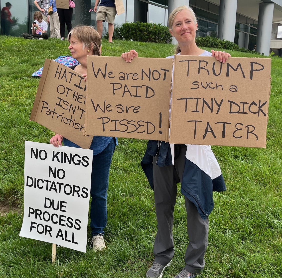 Cars and trucks honked their approval as the crowd waved hand-made signs and American flags as suggested by the national organizers. The signs emphasized support for democracy and opposition to fascism and various policies of the Trump administration. Some used profanity to emphasize their message.